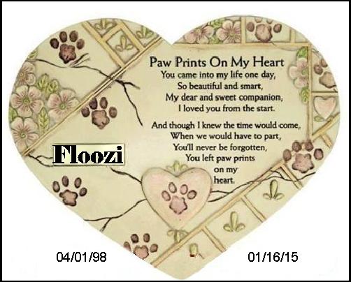"Floozi" ![]() 04/01/98 -- 01/16/15 (CH Woodlyn MopTop Night Music SOD X CH Jewels Dazzlin Gem Woodlyn DOM) ![]() ![]() ![]() (Tile gift from Julie Wells) WEEP NOT Do not weep for me when I am gone For I have Friends in the great beyond. All the little ones I used to feed Will Come to me in my time of need. They will purr and bark in great delight, And I will hold and hug them tight. Oh what a great day that will be When my furry friends all welcome me. Author: Richard Severo ![]() ![]() HEALTH & GENETICS - 040198-011615 AKC Reg# = TN685387/02 CERF NUMBER = CCR-294/2006--93 Optigen for prcd PRA = Normal/Clear by Parental Default OFFA PLL = CHC-PLL1088/150F-PI - Normal Cardiac = Normal Patellas = Normal ![]() ![]() "Click for Floozi's Show Career" ![]() ![]() "Click for Floozi's Felted Doll" ![]() Floozi's kids ![]() ![]() Crazy Horse, Razz & Floozi at 1 week ![]() 5 weeks ![]() 7 weeks ![]() 4 months ![]() 5 months ![]() 6 months ![]() CCCSC Best In Match 6 months ![]() 1 year ![]() 1 year ![]() First pregnancy with "Fame" ![]() ![]() Angels are cresties with wings ![]() ![]() ![]() ![]() ![]() Floozi playing at 12 yrs 10 1/2 mos old ![]() Floozi at 12 yrs 10 1/2 mos ![]() Floozi at 13 yrs 9 mos old ![]() Floozi at 13 yrs 9 mos old ![]() Floozi at 14 yrs 3 mos old ![]() ![]() Floozi at 15 yrs 10 1/2 mos old (photo date: 2/12/14) ![]() Floozi at 16 yrs (photo date: 4/01/14) ![]() Floozi at 16 yrs, 8 1/2 mos (photo date: 12/11/14) ![]() Floozi at 16 yrs, 9 mos, 16 days (photo date: 1/16/15) She was, if possible, dearer to me in her decrepit old age than in her radient youth. Calmly she accepted her infirmities, depending upon me with implicit faith. My joy, my heart, my dog-daughter...I love you and feel your spirit in quiet moments. Run free now...until I see you again. ![]() ![]() "Mother Dazzle" ![]() CH Jewels Dazzlin Gem Woodlyn, DOM (09/15/96 -- 01/24/12) Floozi's mother Dazzle at 15 yrs 3 1/2 mos(1-3-12) ![]() |